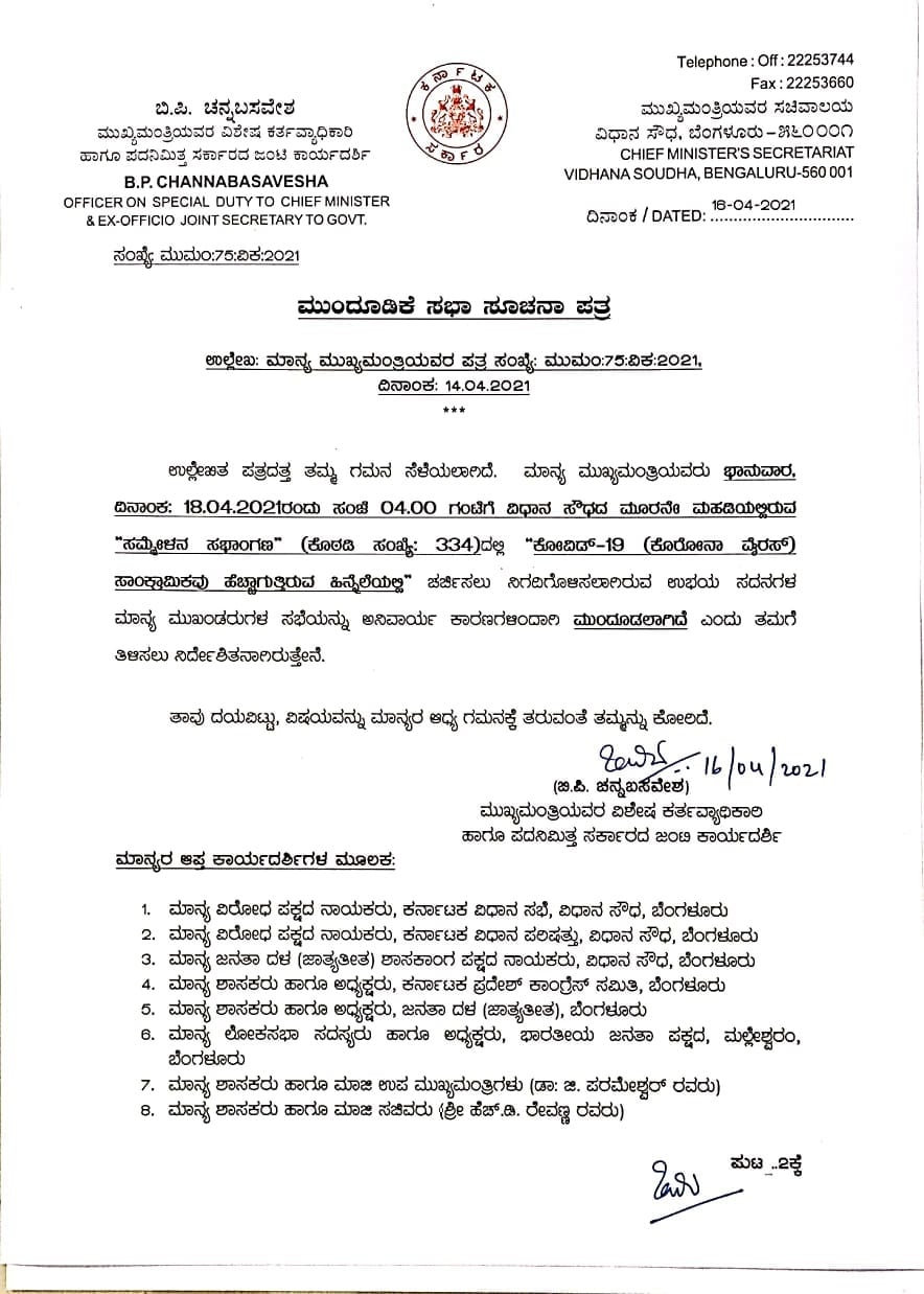 ರಾಜ್ಯದಲ್ಲಿ ಕೊರೋನಾ ಮಹಾಮಾರಿ ದಿನದಿಂದ ದಿನಕ್ಕೆ ಏರಿಕೆಯಾಗುತ್ತಲ್ಲೇ ಇದ್ದು , ಆತಂಕ ಎದುರಾಗಿದೆ. ಈ ನಿಟ್ಟಿನಲ್ಲಿ ಲಾಕ್ಡೌನ್ನಂತಹ ಕ್ರಮ ಒಂದೇ ಪರಿಹಾರವಲ್ಲ. ಇದರ ಹೊರತಾಗಿ ನಿಯಂತ್ರಣಕ್ಕೆ ಯಾವ ಕ್ರಮ ಕೈಗೊಳ್ಳಬಹುದು ಎಂಬ ಕುರಿತು ಅಭಿಪ್ರಾಯ ತಿಳಿಸುವಂತೆ ಸಿಎಂ ಉಭಯ ಸದನ ನಾಯಕರ ಸಭೆ ಕರೆದಿದ್ದರು.